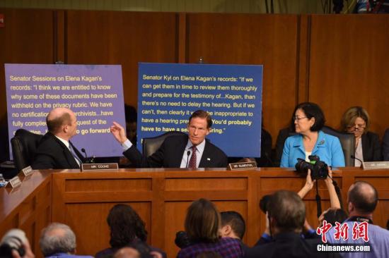 当地时间9月4日,美国参议院司法委员会就布雷特?卡瓦诺出任最高法院大法官举行提名听证会,民主党参议员要求推迟听证会。 中新社记者 邓敏 摄