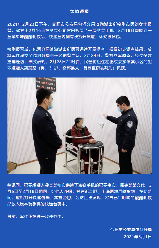 经讯问,犯罪嫌疑人龚某某如实供述了盗窃手机的犯罪事实。据龚某某交代,2月6日至2月18日期间,其往返合肥、上海两地运输货物。在此期间,龚某某打开快递包裹,实施盗窃。为防止被发现,将自己平时喝的酸酸乳饮品放入原本装手机的快递包裹中。